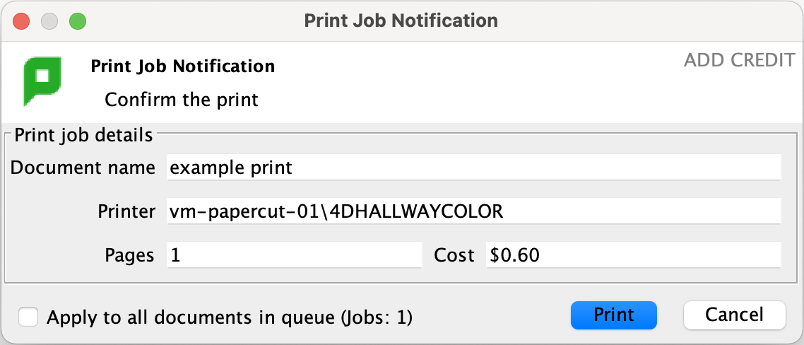 To confirm click Print, the job will be sent to the printer and your account will be charged
